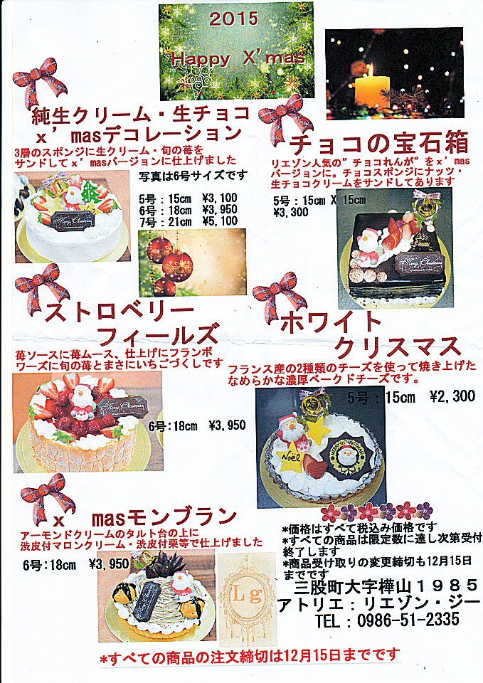 Xmasケーキのご予約は、12月15日までとなってますので宜しくお願い致します。
